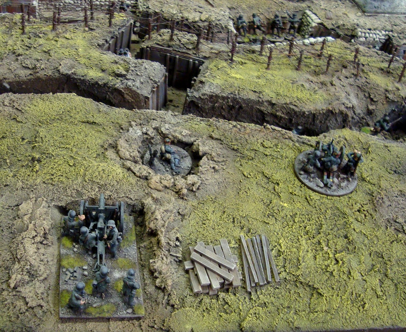 One very minor disappointment is that the terrific table built by the Gripping Beast/ Woodbine Design team for “Over the Top” doesn’t feature more prominently. I had the pleasure of seeing this at the Scarab/ Gripping Beast games day in December 2009, and it really was fantastic. So, I thought I would post my own pictures of that table as a bit of “Over the Top” eye-candy on this Blog post, with all the credit to the table builder Wynn Rogers and the Gripping Beast team who helped.