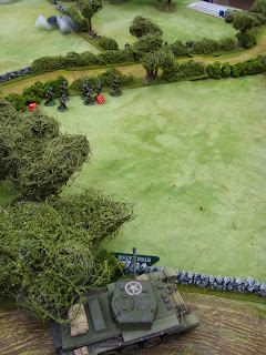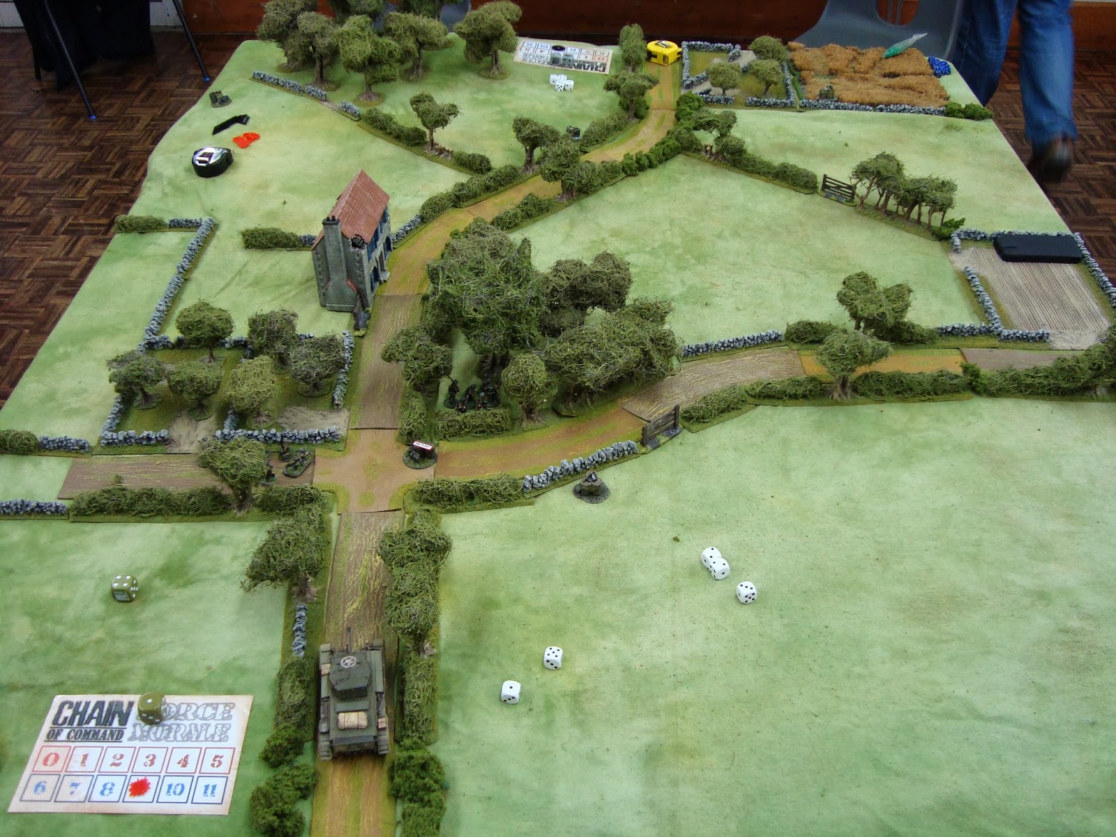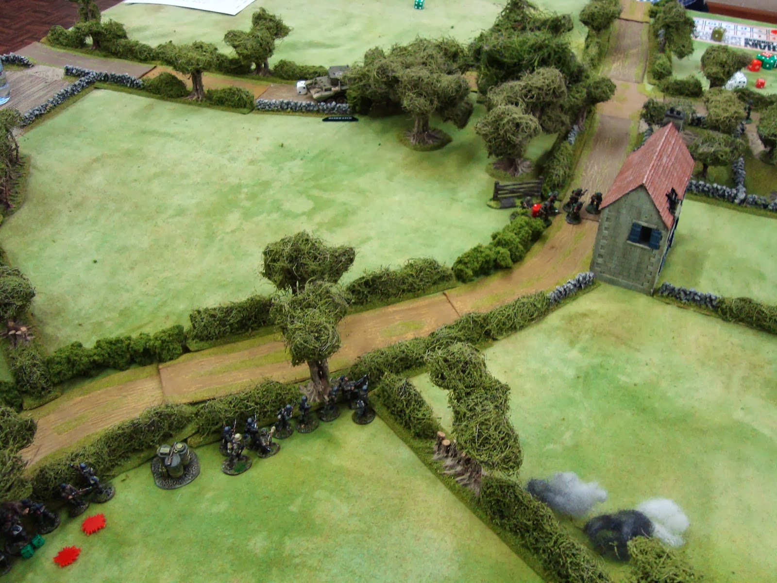 Although the British has a full platoon and a Cromwell tank in support, making progress against a German platoon and a fine defensive position can still be hard work. The luck favoured both sides fairly easily, but the British assault was broken eventually by the inability of the Cromwell to effectively fire on the German defenders on account of the smoke liberally peppering the battlefield from the British 2" mortars! A salutary lesson for any would-be Royal Engineers on a wargames table!