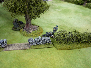 The game was a lot of fun, and as we're playing through Richard's campaign supplement we're finding quite a few things developing. First, both sides are more cautious in approaching defensive positions, mainly out of respect for the effect of bi-pod mounted machine guns in strong positions. Second, both sides are probing first and hitting once the enemy are discovered - we're trying to follow the tactics laid down in the military manuals of the time (thoughtfully supplied by Richard to the players). Third, some of the characters formerly thought of as utter duds are coming good. To my amazement, Second Lieutenant St Clair is finding his feet in the campaign - which is a great pleasure considering he was first rolled up to test the effect of a "shell-shock rule"!